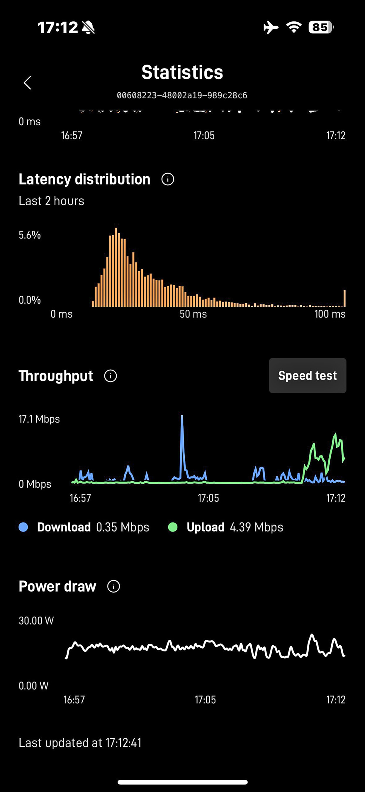 How’s the quality? It’s quite good. You can easily stream video and audio—even with multiple users—without any problem. The few test FaceTime calls we’ve made performed well. We typically saw speeds from 55 Mbps up to a high of 122 Mbps. The antenna orientation matters, as does the direction of flight. The Orientation tab in the Starlink app will give you a real-time graphic view with cues showing you how to rotate and elevate the antenna for best signal strength. This is challenging to do in the plane so you should plan for periods of lower speed (and possible disconnections) depending on your heading and the antenna orientation. The app also contains a built-in speed test that gives you an instantaneous upload/download speed meter. There’s also a handy “statistics” view that shows latency, throughput and power consumption data.