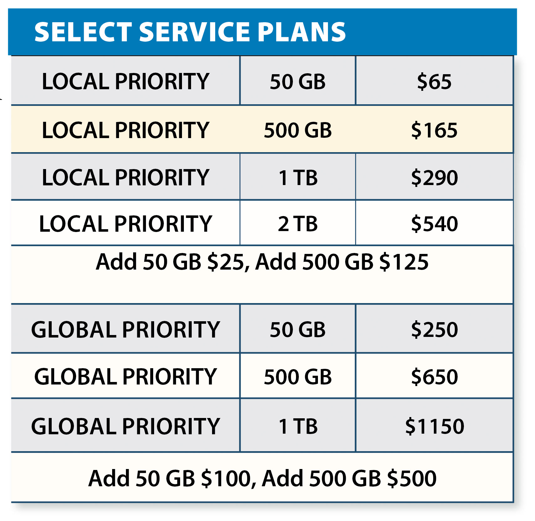 Each plan allows you to buy blocks of data in either 50-GB or 500-GB increments. You have to buy at least one block along with whatever plan you choose; if you run out of data, your connection speed will drop drastically unless you buy another block.