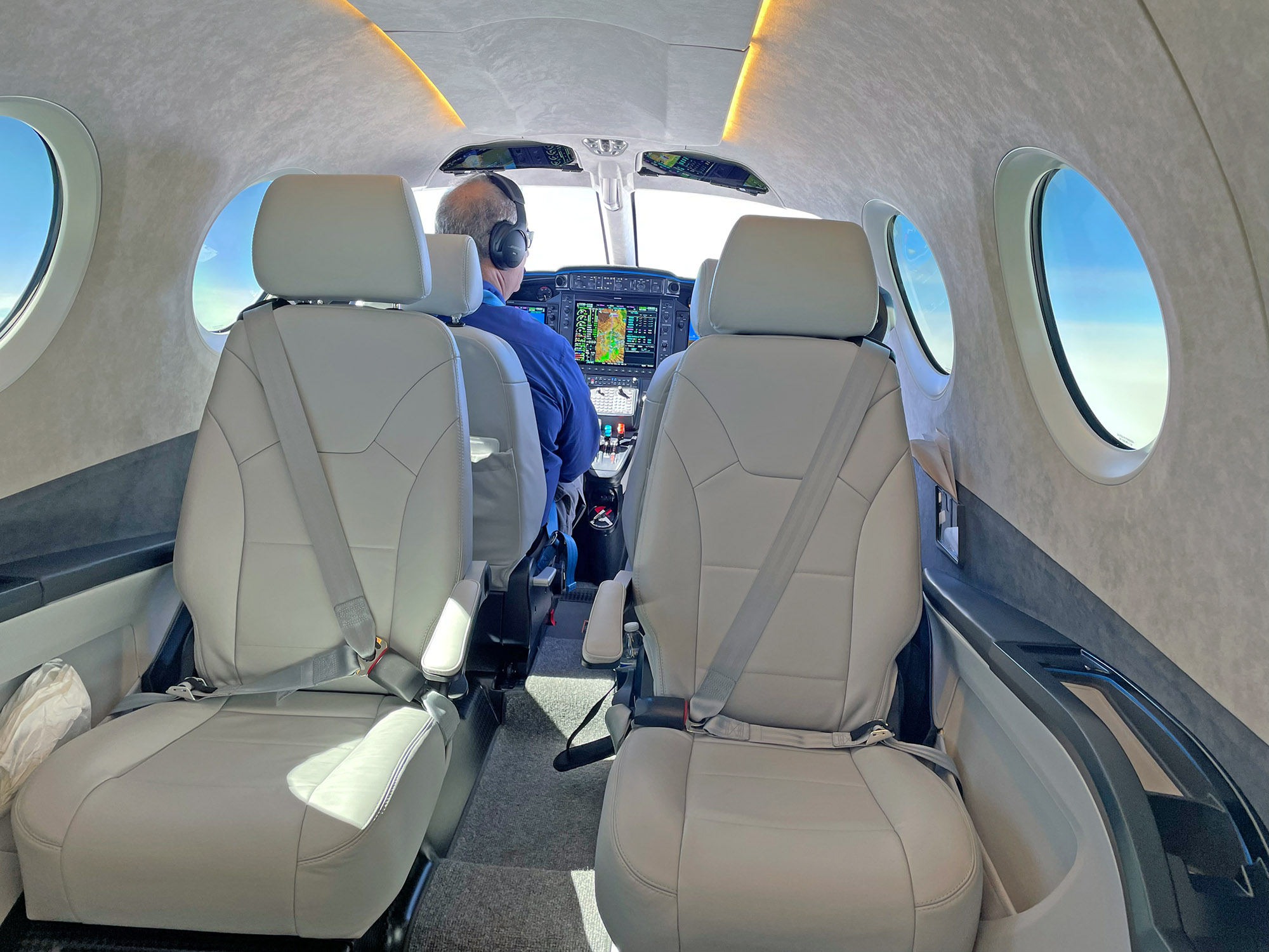 The cabin is large for this class of single-engine turboprop, 4 feet 11 inches tall and 4 feet 7 inches wide. Epic advertises the pilot seats as adjustable for pilots up to 6 feet 8 inches tall. We agree. The passenger cabin is also suitable for large folks with the club-seated passengers not required to interlace legs.
