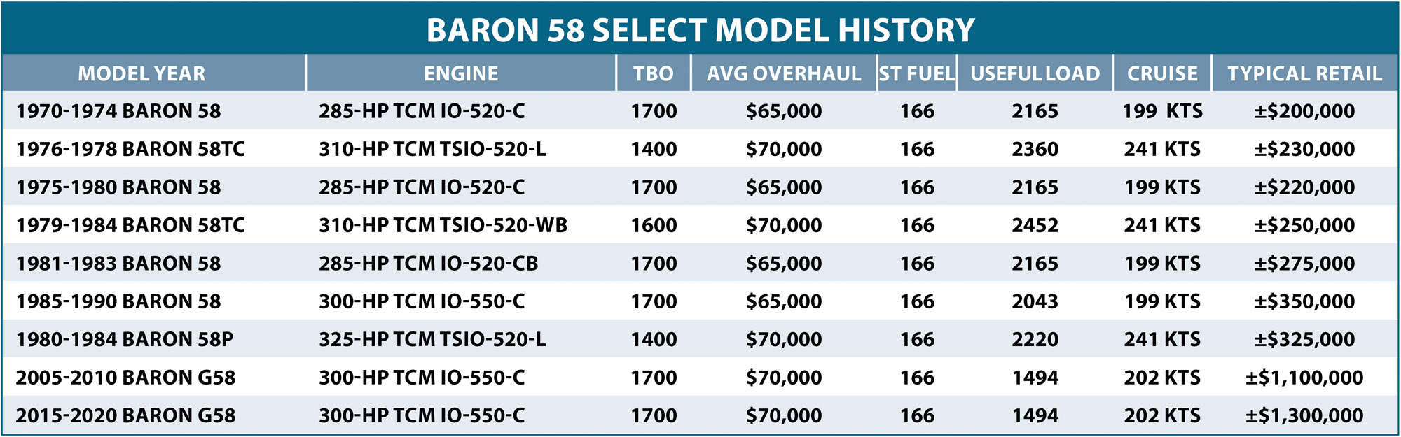 Engines on the first 58s were Continental IO-520-Cs of 285 HP each. These engines had the so-called light crankcases, notorious for cracking. Later, the IO-520-CB became standard, but earlier 58s may be fitted with either.