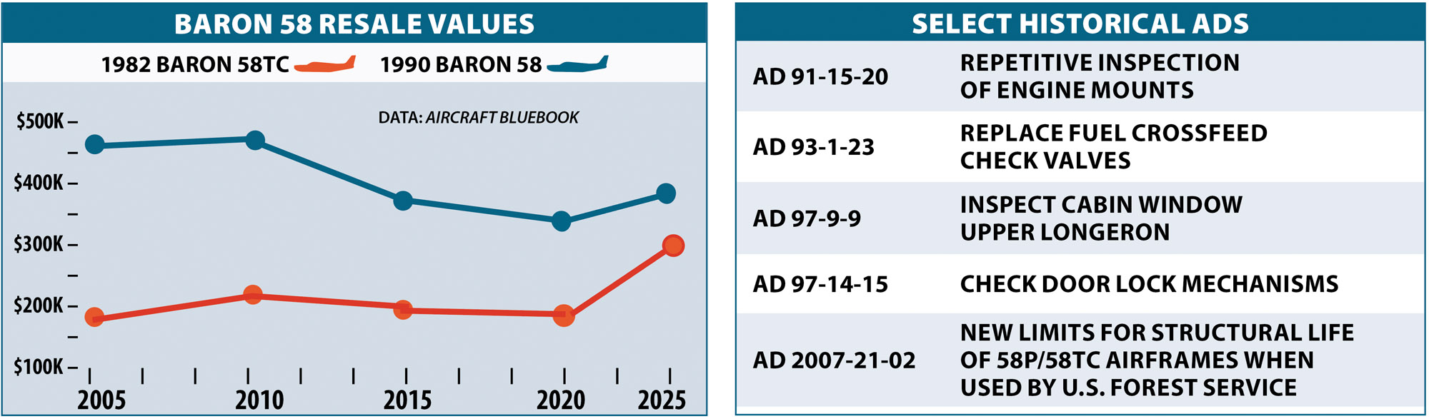 “Insurance is considerably higher than the Bonanza was, with yearly premiums running about $5000 over the last two years. Despite the higher fuel costs, unexpected maintenance and not having flown as much as usual, I estimate all-in operating costs (fixed and variable) last year were around $300 per hour,” Christian Nichols told us of his Baron. “I owned a Baron 58TC for over 15 years, and I studied the normally aspirated 58 before buying it, but the advantages of safety made the 58TC a better choice. Things like a Va of 170 knots instead of 156 knots and a single-engine service ceiling of 14,400 feet instead of about 7000 feet were important when flying in the West (although the single-engine rate of climb was lower because of the much higher gross weight),” Larry Weitzman said.