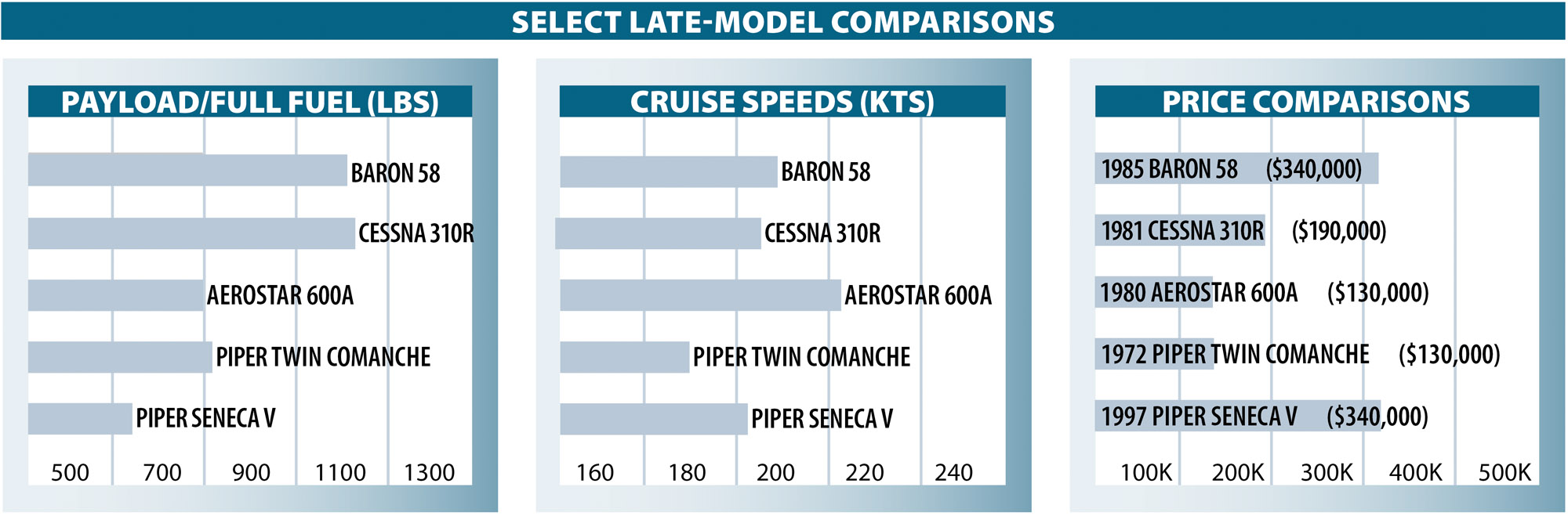 As light twins go, all of the 58s have comparatively good payload with full fuel. A typically equipped older 58, with auxiliary fuel giving a total of 166 gallons usable, can lift 724.5 pounds and fly for approximately 5.5 hours at an intermediate power setting—a still-air range of just over 1000 NM—with IFR reserves. Newer 58s can carry six people (that’s FAA 170-pounders) and luggage roughly 600 nautical miles with reserves. A typically equipped 58P has a full-fuel payload of just over 700 pounds and a range at roughly 60 percent power of more than 1100 NM at either 15,000 or FL 250 (TAS is 201 at the lower altitude and a smoking 218 at the maximum of FL 250).